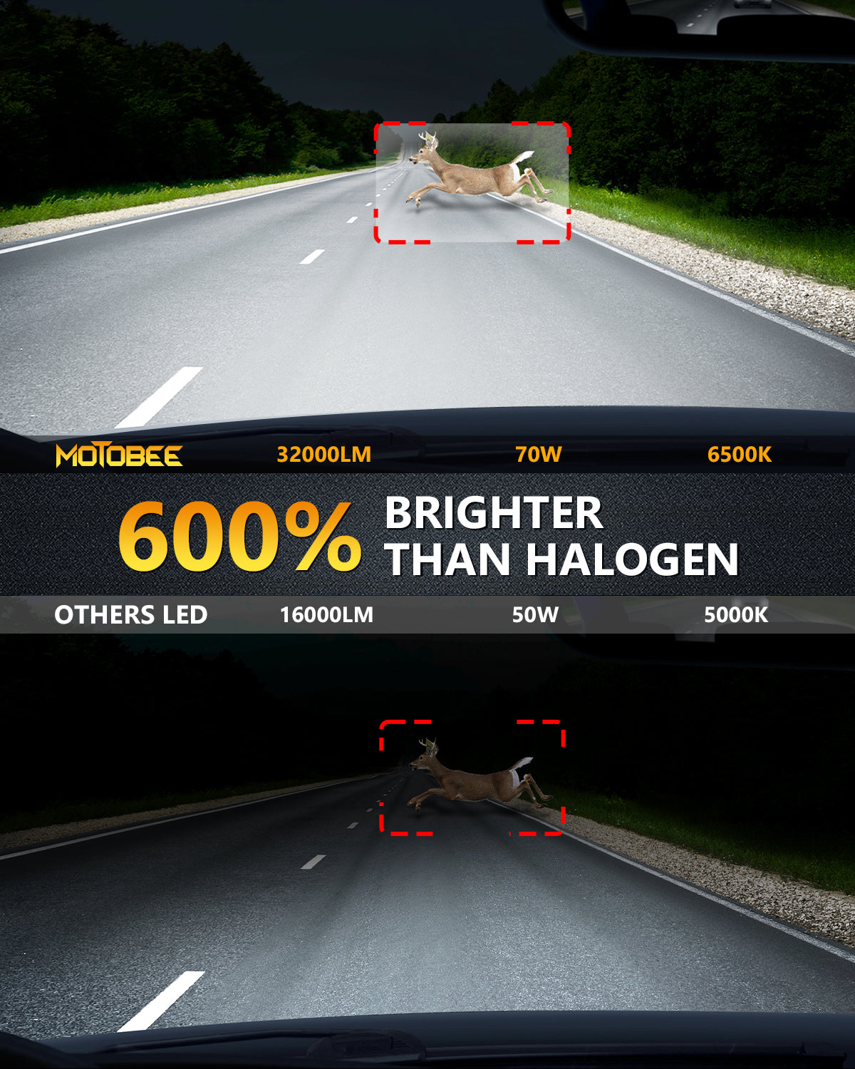 MOTOBEE H11 headlight bulb is outstandingly bright, which can bring you a better driving experience. 70W high power brings true 32,000LM high brightness experience, 6500K cold white light restores high-definition field of vision, 600% brighter than halogen lamps, make your night as bright as day.