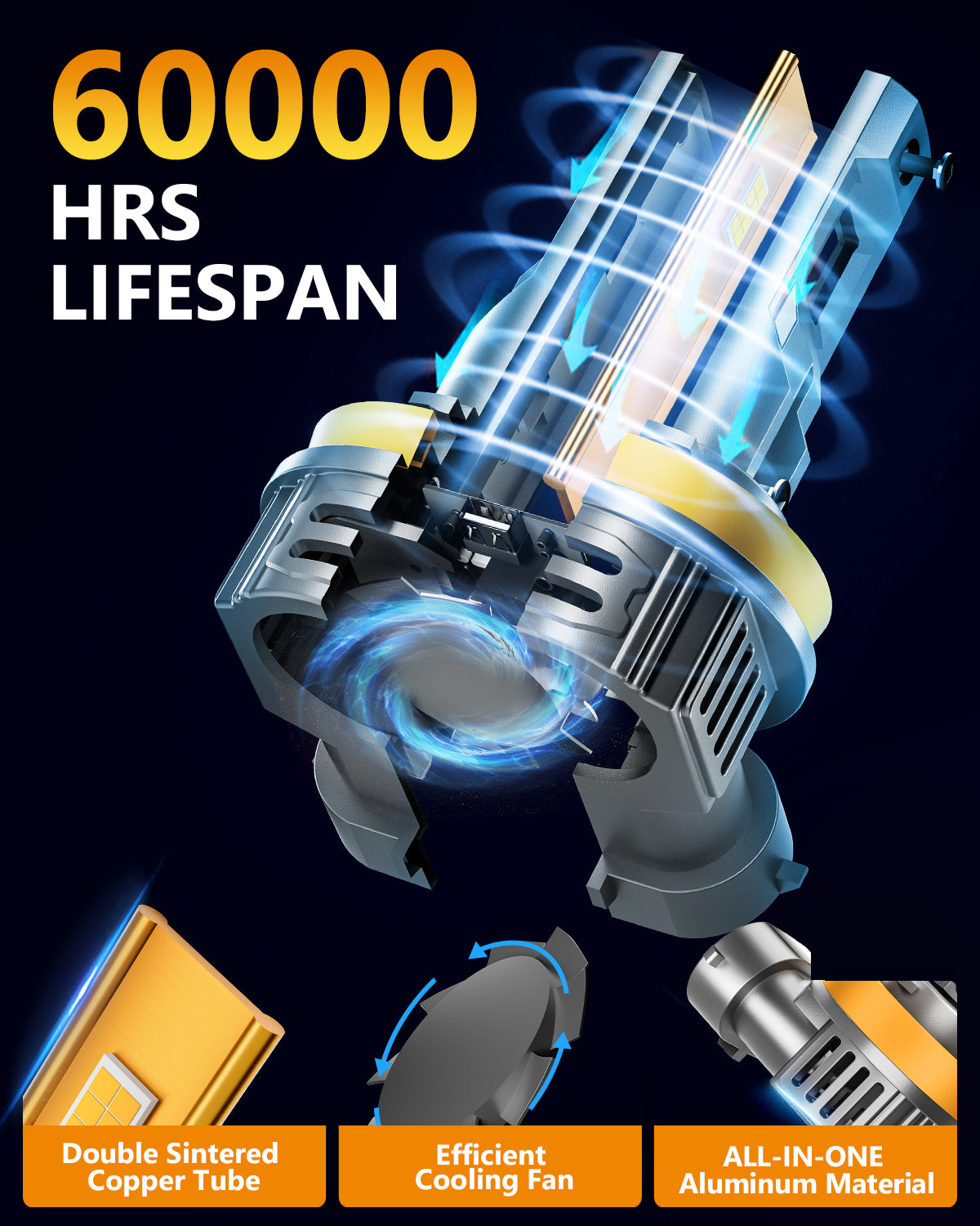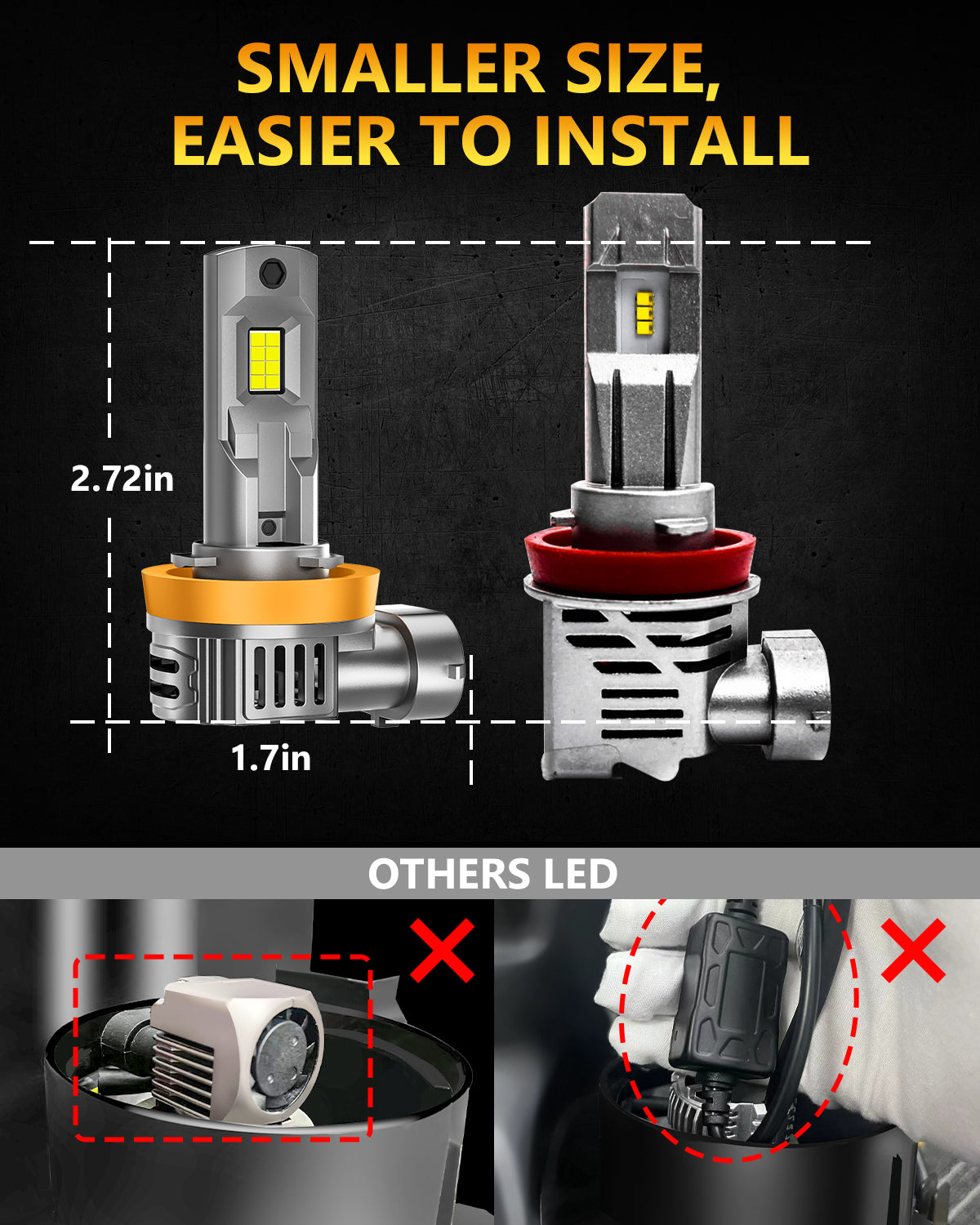Beforehand, all light bulbs of equivalent mini size did not have a cooling fan, which would cause the headlight to diminish in brightness and reduce its lifespan at high temperatures. With structural upgrades, our led headlights innovatively integrates a cooling fan in the very small size of the light and has built-in heat-dissipating copper tubes and plates, which effectively reduce the temperature of the bulb and Maintain the best brightness.